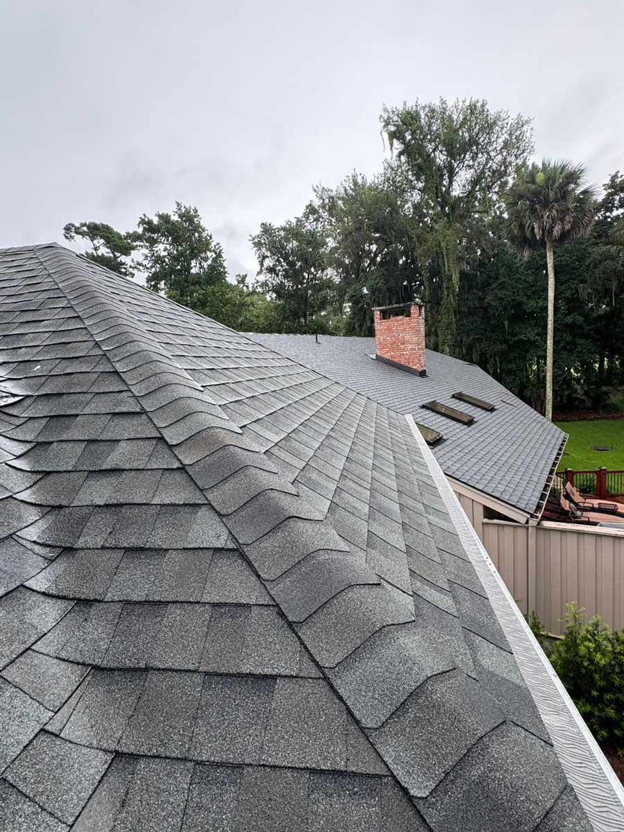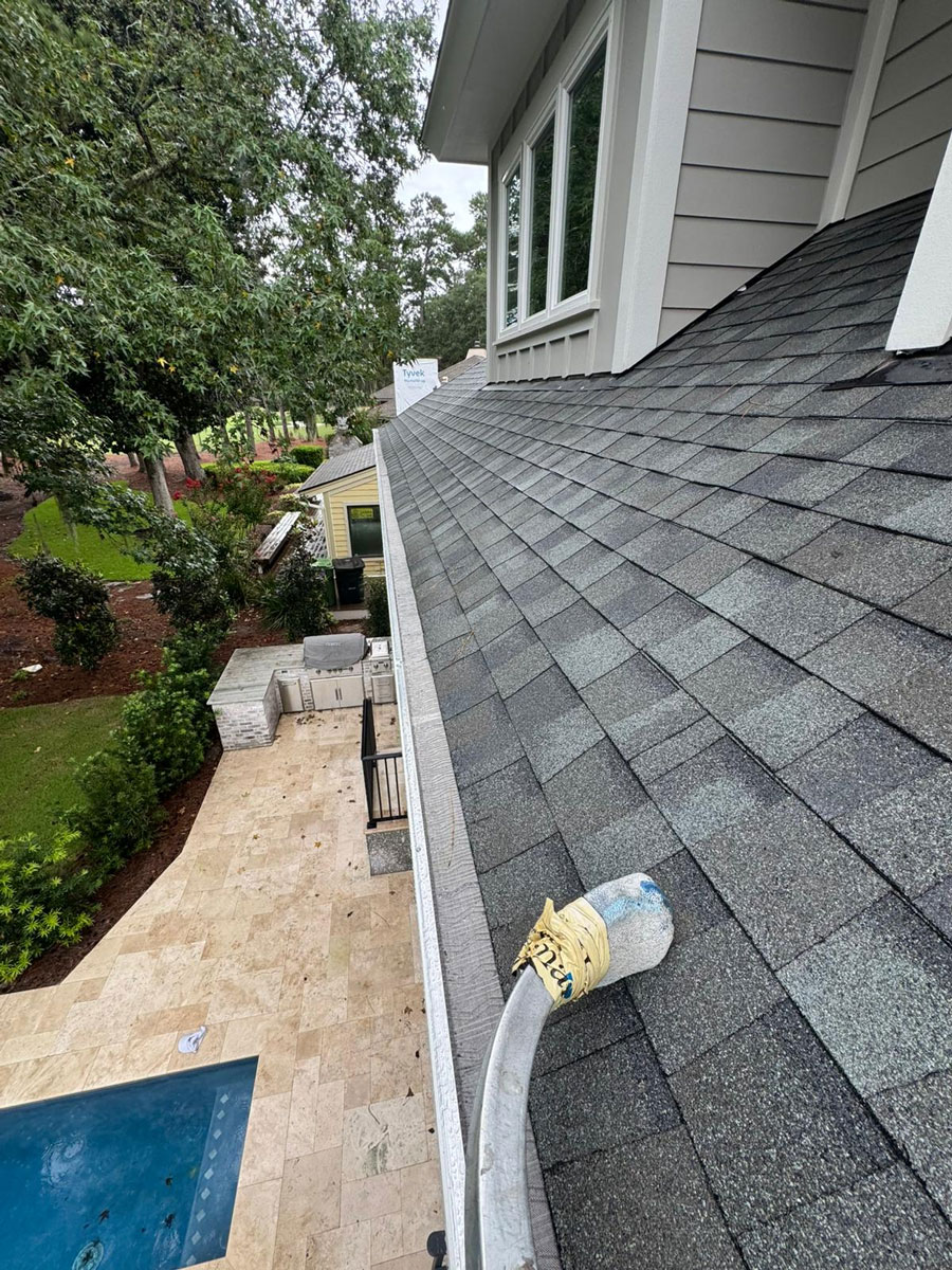 In neighborhoods like Sea Pines and Shipyard, heavy tree canopy increases pine needle buildup in valleys. Water dams form during intense rainfall. When water sits instead of shedding properly, it forces its way beneath shingles and into vulnerable transitions.