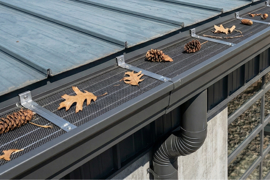 It sits on the curved nose of the cover and either blows off in the next wind event or washes down the face of the cover and off the roofline during the next rain. Pine needles and leaf debris don’t accumulate on a smooth curved surface the way they pile up in an open channel. Over time, the debris that lands on the cover moves off the roofline the same way it would off any sloped surface — gravity and weather handle it without any intervention.